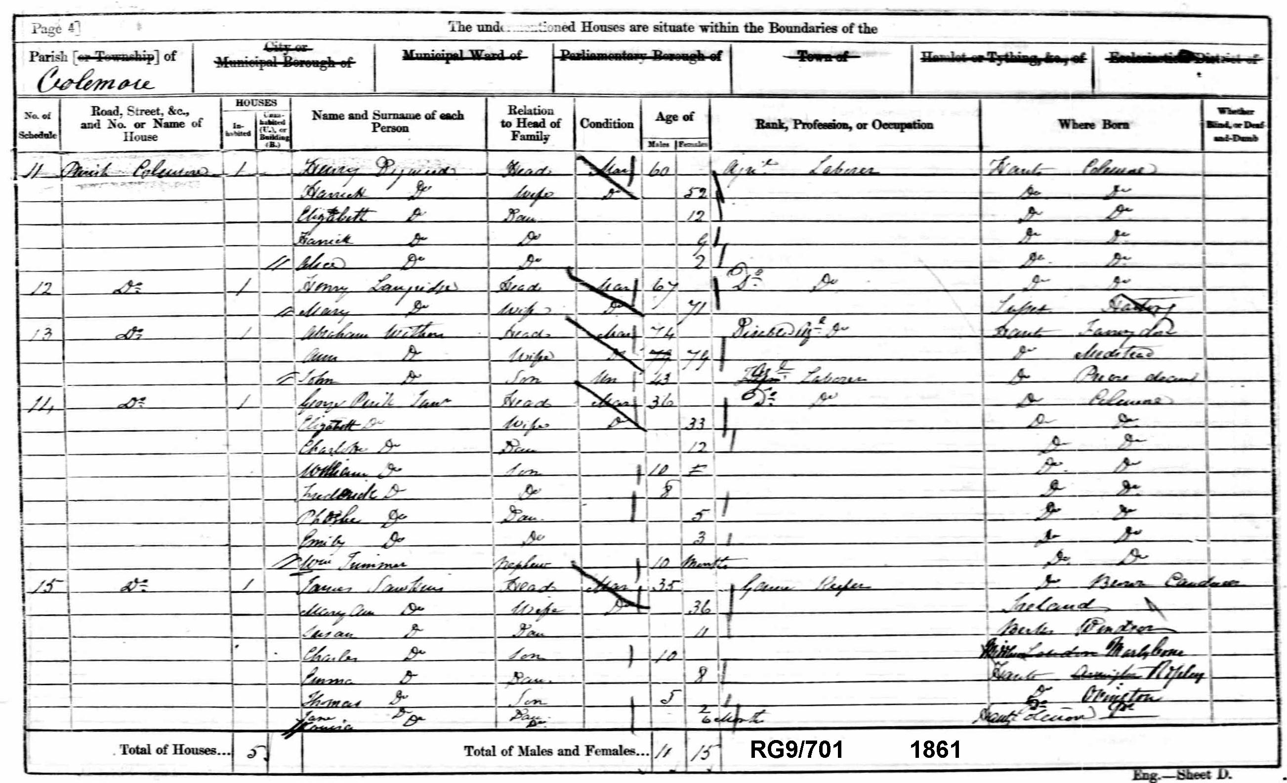 Colemore 1861 Census Returns - Taken on the night of Sunday 7th April 1861