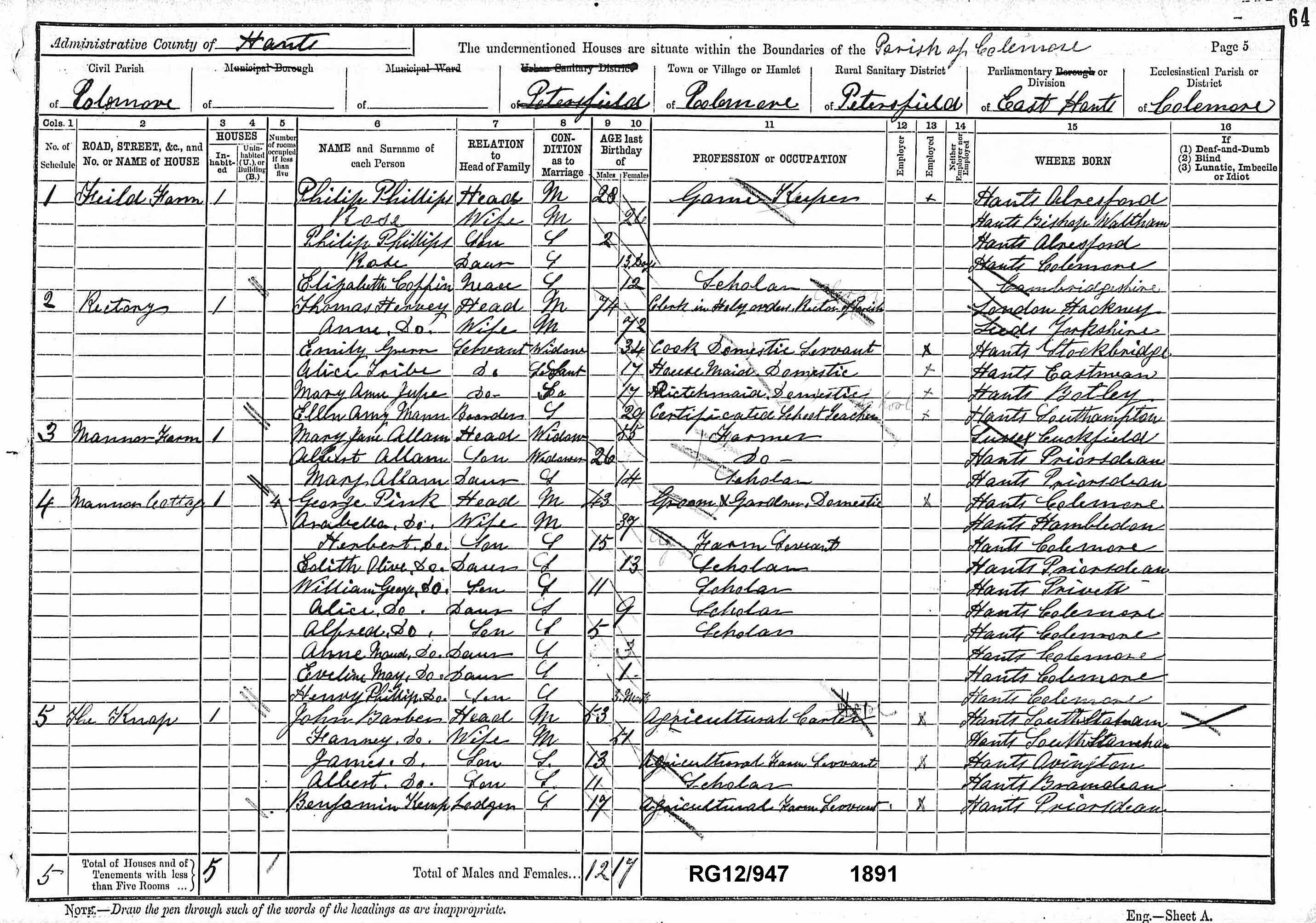 Colemore 1891 Census Returns - Taken on the night of Sunday 5th April 1891