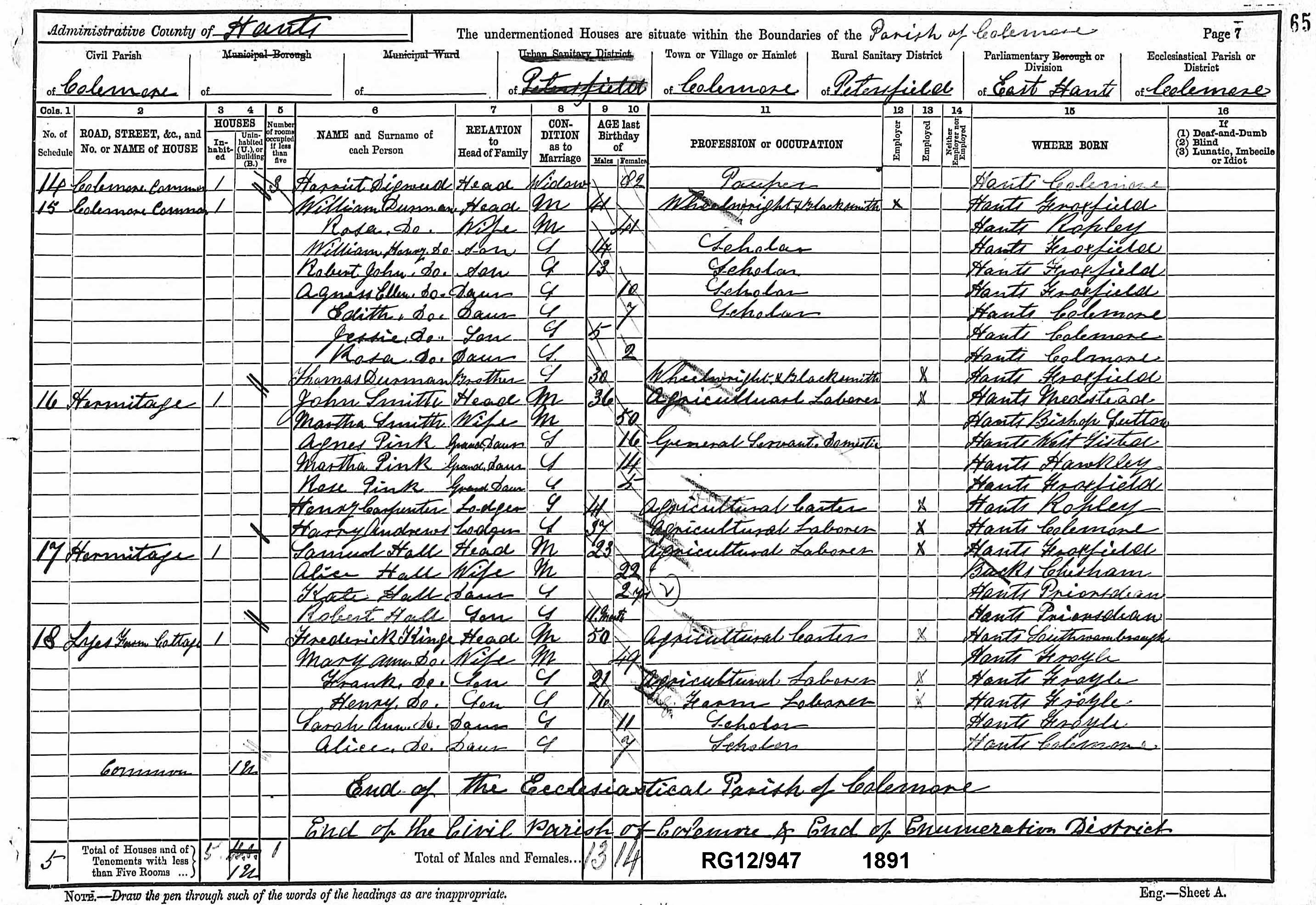 Colemore 1891 Census Returns - Taken on the night of Sunday 3rd April 1881